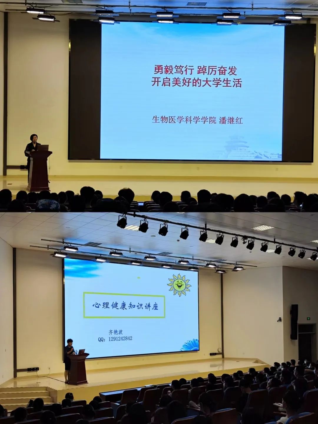 8月30日晚,学院党委书记潘继红对新生们进行了大学生理想信念教育,作了题为“勇毅笃行,踔厉奋发,开启美好的大学生活”的报告。潘书记就三个关键词,分别是理想信念、规则规矩、进取精神展开讲述,就党的十九届六中全会及党的第三个历史问题决议的精神进行了报告,激励大家自觉践行社会主义核心价值观,为实现中华民族伟大复兴的中国梦贡献青春力量,引导同学们做爱党爱国、积极进取的新时代青年,同学们反响热烈。随后,心理健康教育中心齐艳波书记为同学们作了心理健康知识讲座,从影响大学生心理健康的多个角度,由浅入深地分析了大学生中存在的各种心理障碍以及遇到心理问题时的解决方法,包括学业压力、人际交往、情感纠纷问题等,并列举多个真实生动的案例,对同学们进行一步步引导,使同学们加深了对心理健康的认识,同时学到了心理调节的方法。