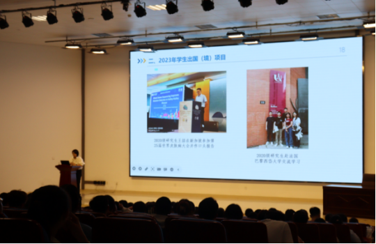 对外合作交流部的王敬老师向同学们解读了学校的学生出国(境)办理和资助政策,分别从出国(境)的管理、渠道、奖励政策等方面进行了讲解,还给同学们展示了2023年暑期学生出国(境)项目,并介绍了各项目的申请条件和项目内容,鼓励同学们在大学期间通过学校途径参加出国(境)项目,拓展视野,提升专业学习能力。