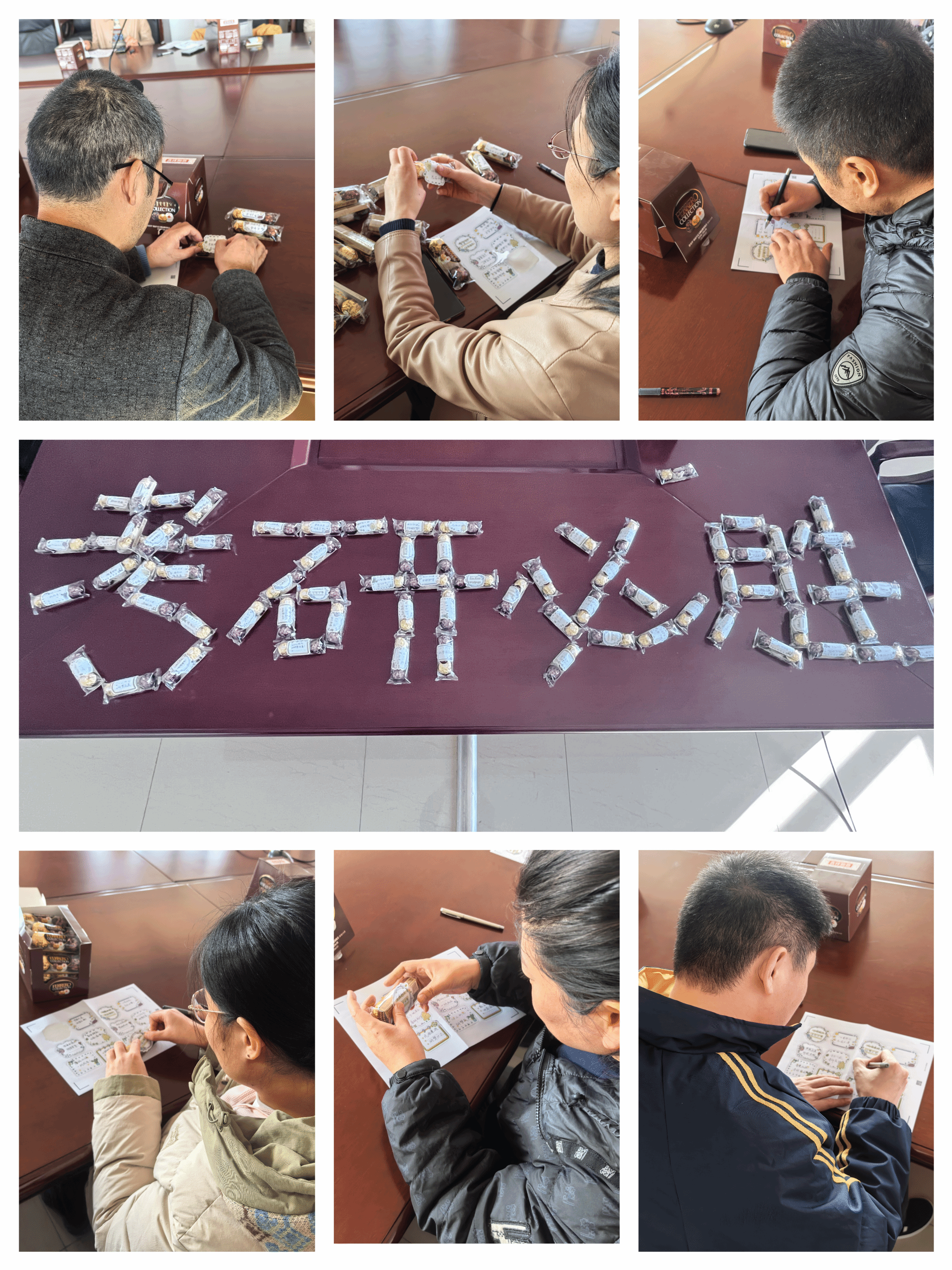 学院专业课教师、辅导员亲笔书写考研寄语。“研途有你,未来可期”“专注当下,终成硕果”……一句句温暖有力的话语贴在包装上,让小小的巧克力成为承载老师关怀的“能量棒”,将师恩与鼓励精准传递到每一位学子手中。