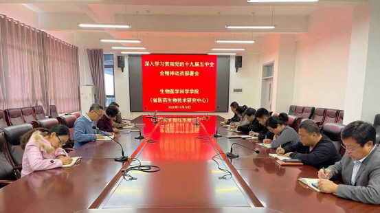 2020年11月19日上午,v站体育官网(省医药生物技术研究中心)领导班子全体成员参加了校(院)组织的党的十九届五中全会精神宣讲会,并于19日下午组织召开学院(中心)全体党员会议,传达宣讲会精神,并就学院今后一段时期深入学习贯彻党的十九届五中全会精神做出动员部署。