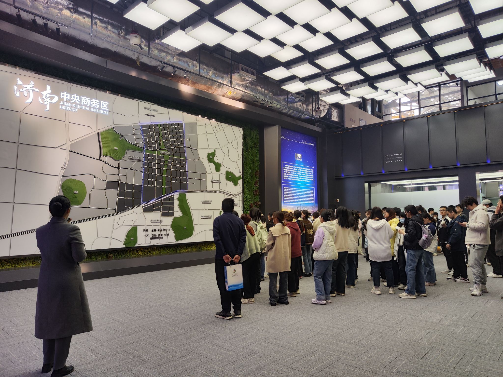 在济南中央商务区,通过工作人员讲解和观看宣传片,同学们详细了解了中央商务区的独特优势、目标定位和产业布局、发展现状,深切感知济南经济发展的强劲动力。
